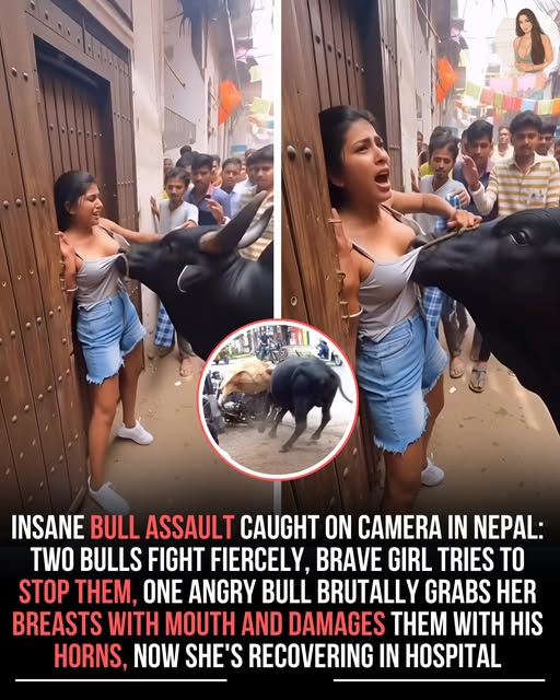 A shocking viral video from Nepal shows two bulls fiercely clashing in a narrow alley. A brave young woman in a tank top rushes in to stop the fight by grabbing one bull’s rope. In a horrifying moment, the enraged bull turns, brutally bites her breasts with its mouth, and damages them further with its sharp horns. She screams in pain as bystanders intervene. Rushed to hospital, she’s now recovering from serious chest injuries but is out of danger. The clip highlights the risks of intervening in animal fights.