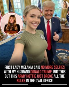 A viral selfie shows a smiling young woman in military attire posing next to President Donald Trump in the Oval Office, where he flashes a thumbs-up and his signature grin. The casual, personal photo—taken during a routine military visit event in early 2026—quickly spread across social media despite Melania Trump’s reported stance against such informal selfies with her husband. The image has sparked massive online debate, with fans praising it as “peak American energy” while others call it a clear protocol breach, racking up millions of views in hours and fueling the latest wave of Trump-era internet controversy.