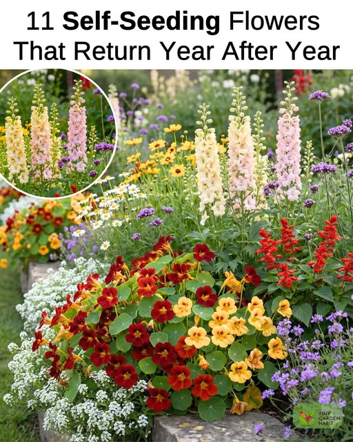 Well, in the simplest words, self-seeding flowers drop seeds at the end of their blooming cycle, grow new plants by themselves, and return year after year without needing to be replanted.