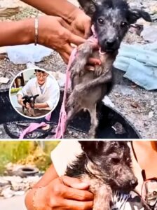 The photos released by the rescue team tell a story that words alone struggle to carry. In them, a small dog stands tethered to a narrow roadside, surrounded by trash and decay, his chain cutting short every possible movement. The road is quiet, almost forgotten, but the evidence around him makes one thing painfully clear: he had been there for a long time, unseen and uncared for.
