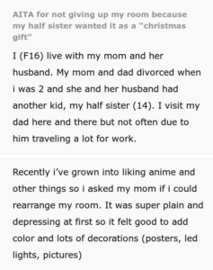 That’s why this teen girl was thrilled to turn her bedroom into the room of her dreams. But when her half-sister decided that she wanted the same decorations in her room, she decided that she’d rather not live in that house at all. Below, you’ll find all of the details that the teen shared on Reddit, as well as some of the replies that invested readers left her.